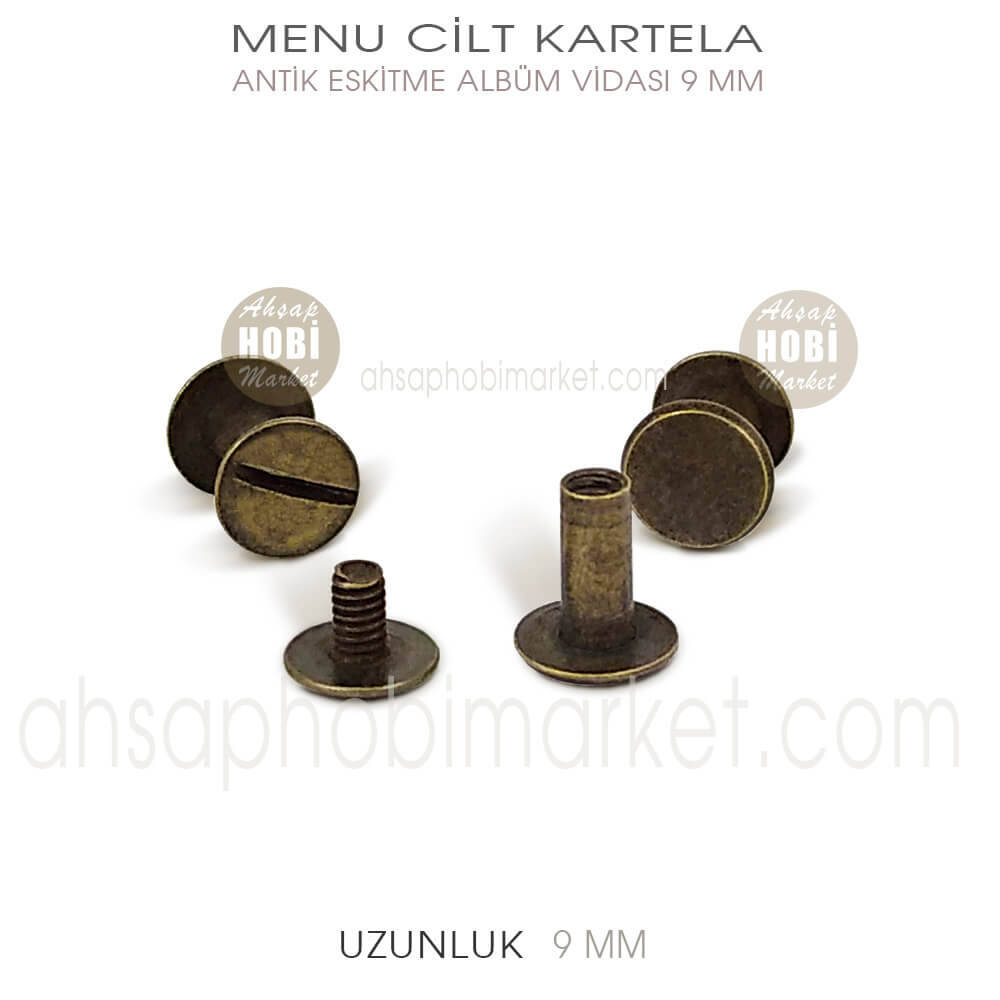 Menü, kartela cilt albüm vidası, 10 mm uzunluğunda (dosya ve yaprakların girdiği net kısım 9 mm), içindeki halka 4 mm çapında (menü kapak ve kağıtların üzerindeki delik için önemli), 8,7 mm çapında vida kafası şeklinde ölçülere sahiptir. Ürünler antik altın rengindedir.