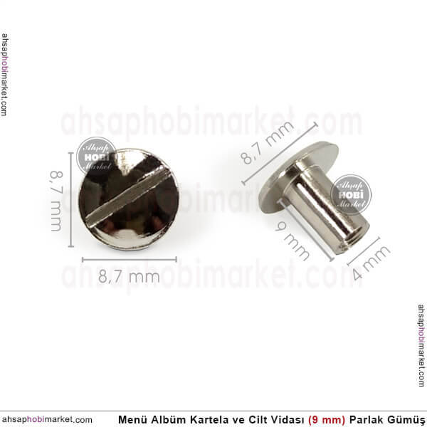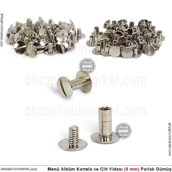 Menü, kartela cilt albüm vidası, 10 mm uzunluğunda (dosya ve yaplakların girdiği net kısım 9 mm), içindeki halka 4 mm çapında (menü kapak ve kağıtların üzerindeki delik için önemli), 8,7 mm çapında vida kafası şeklinde ölçülere sahiptir. Ürünler parlak gümüş renginde nikel kaplamadır.