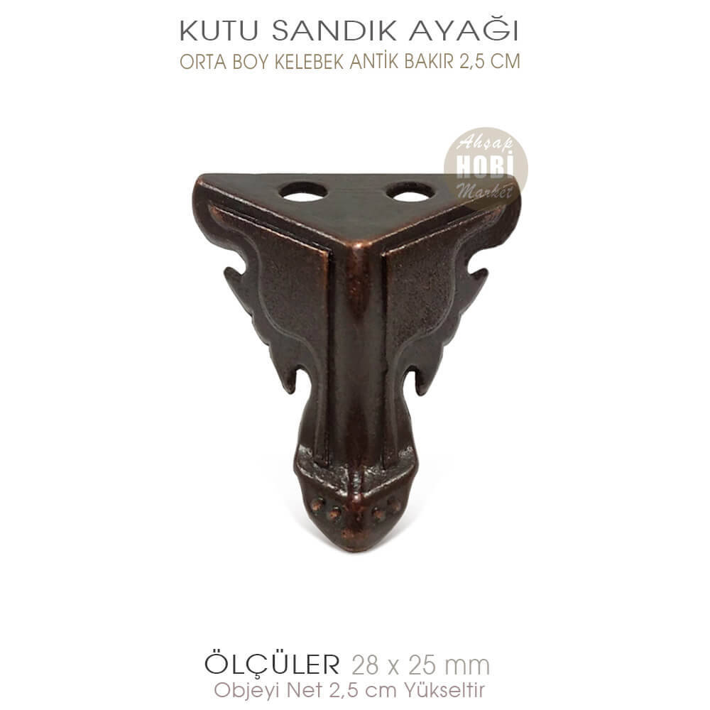 Orta Boy Antik Bakır Renkli Kelebek Modeli Paslanmaz Metal Kutu Ayakları uygulandığı objeyi net 2,5 cm yükseltmektedir. Ürün 2,5 cm uzunluk ve 2,8 cm genişlik ölçüsüne sahiptir.