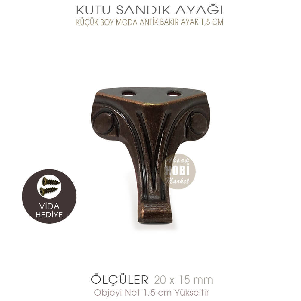 Antik Bakır Renkli Moda Modeli Paslanmaz Metal Kutu Ayakları uygulandığı objeyi net 1,5 cm yükseltmektedir. Ürün 1,5 cm uzunluk ve 2 cm genişlik ölçüsüne sahiptir.