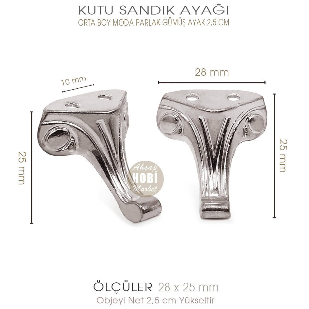 Orta Boy Gümüş Renkli Moda Modeli Paslanmaz Metal Kutu Ayakları uygulandığı objeyi net 2,5 cm yükseltmektedir. Ürün 2,5 cm uzunluk ve 2,8 cm genişlik ölçüsüne sahiptir.