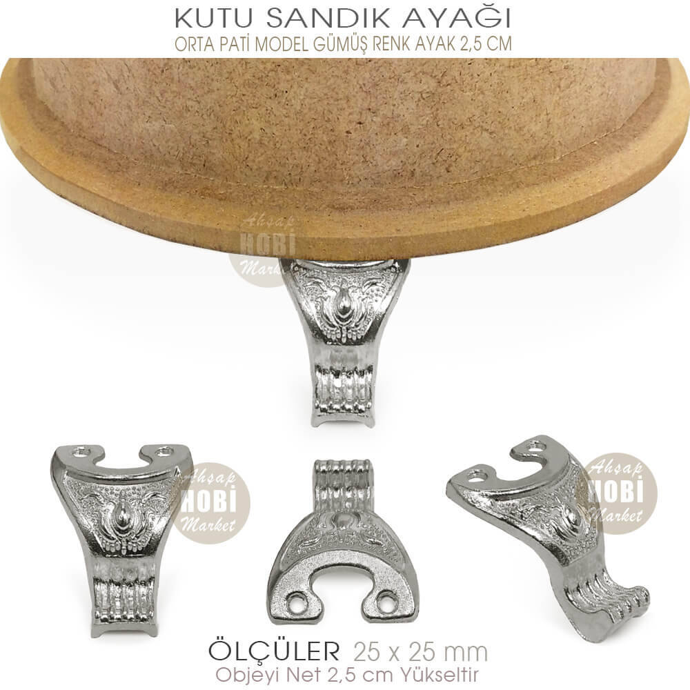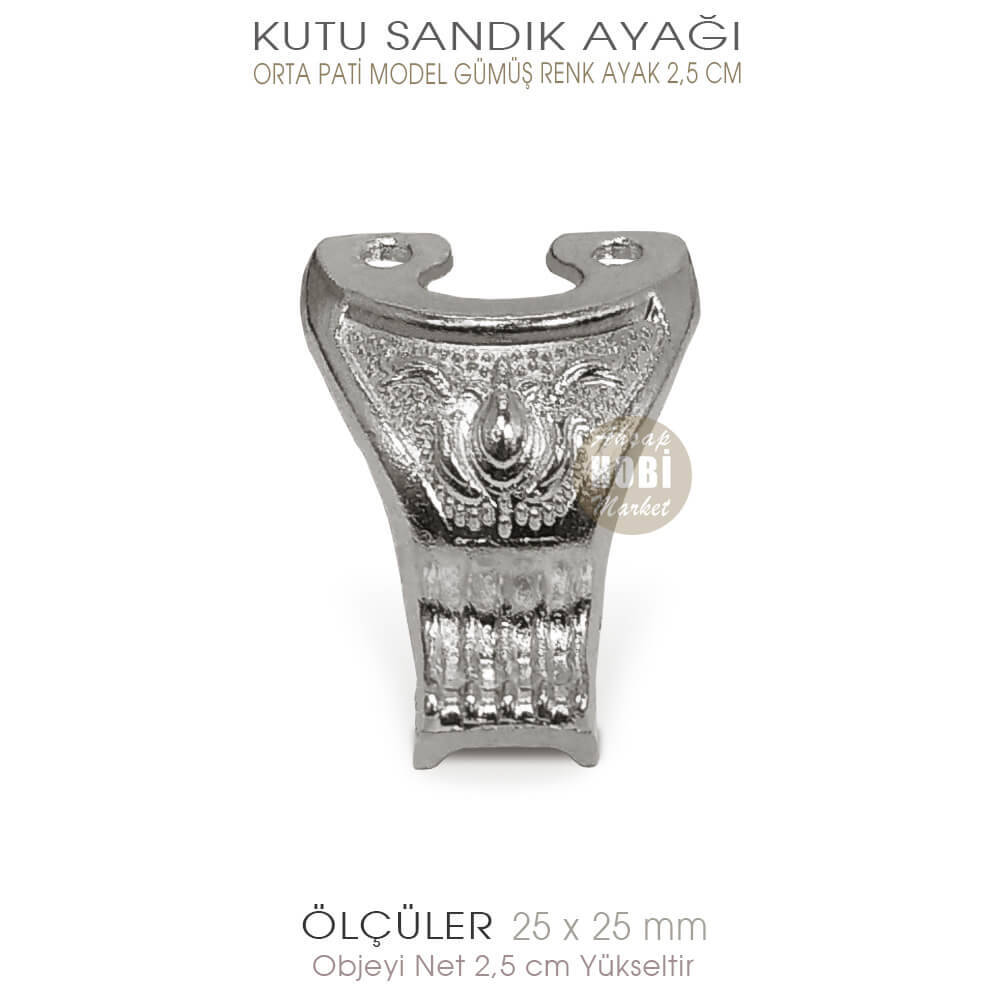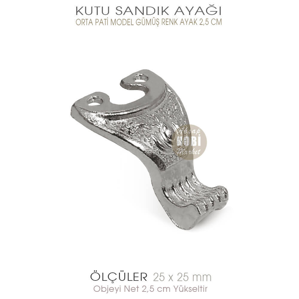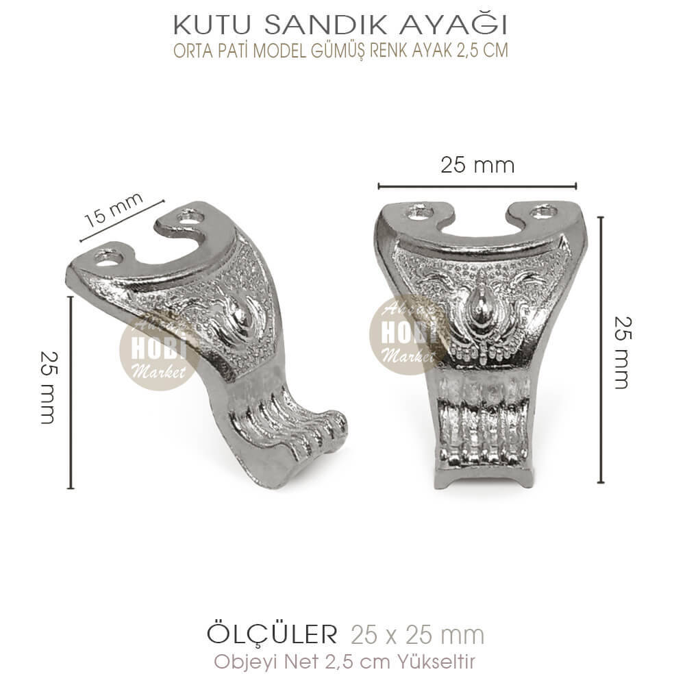 Parlak gümüş renkli pati modeli paslanmaz metal kutu ayakları uygulandığı objeyi net 2,5 cm yükseltmektedir. Ürün 2,5 cm uzunluk ve 2,5 cm genişlik ölçüsüne sahiptir. Yuvarlak ve oval eğimli tüm objeler için ideal ürün olan yeşim pati ayak, köşeli objelerde de kullanılabilir.
