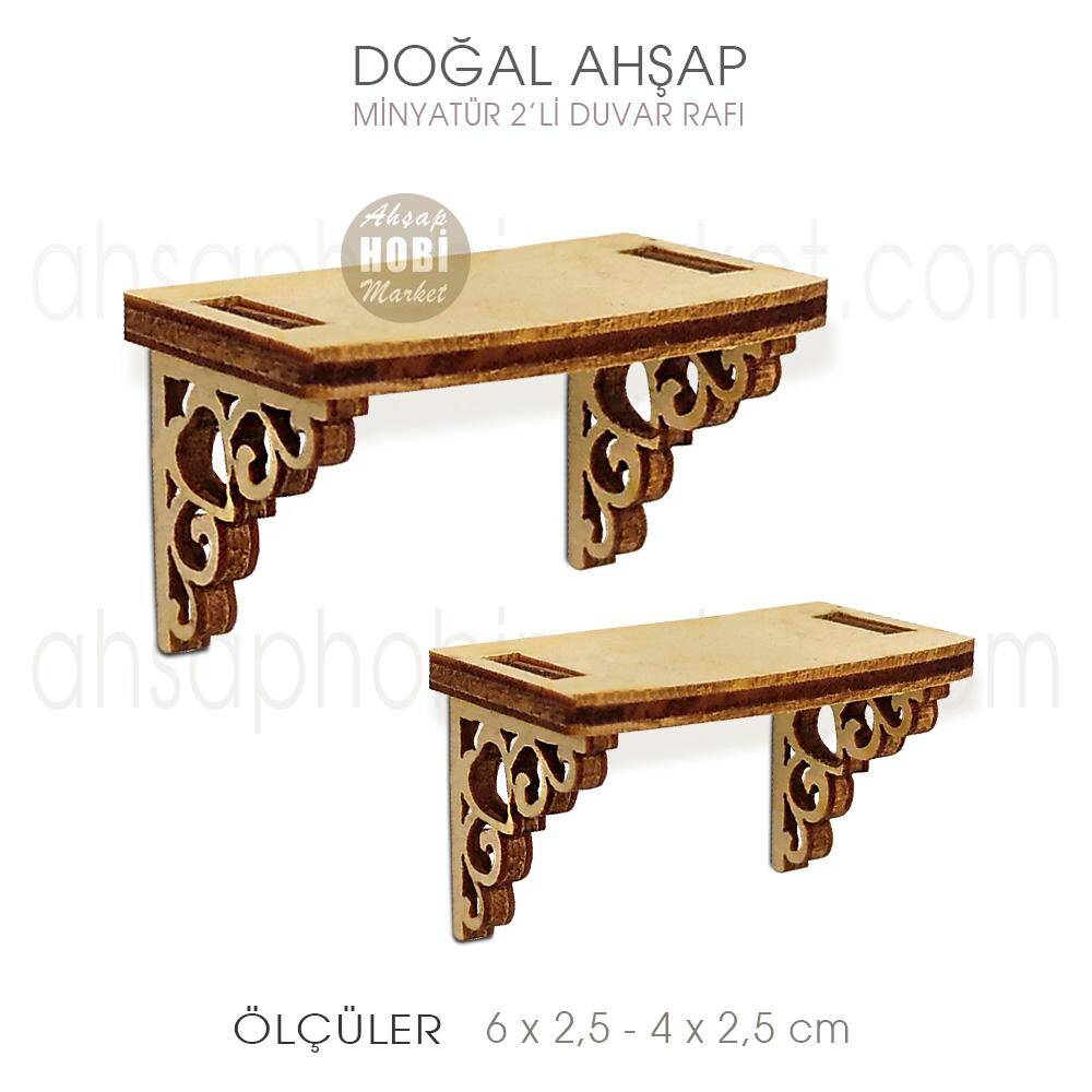 Ahşap Minyatür 2'li Duvar Rafı, 3mm kaliteli kavak ağacı kontradan üretilmiş, barbie oyun evlerinde, oyuncak olarak veya dekoratif maket uygulamalarında kullanılan, ithal plastik ürünlerin aksine doğal ahşaptan imal edilen, çocukların çok seveceği ve oynamaktan sıkılmayacağı, ev eşyası maketleridir. Su bazlı olan ve olmayan, akrilik ve sentetik her türlü boya ve verniğe uygun, uzun ömürlü ve dayanıklı objelerdir. Minyatür eşyalar çocuklar tarafından kullanılacak ise su bazlı akrilik boyaları tercih ediniz.