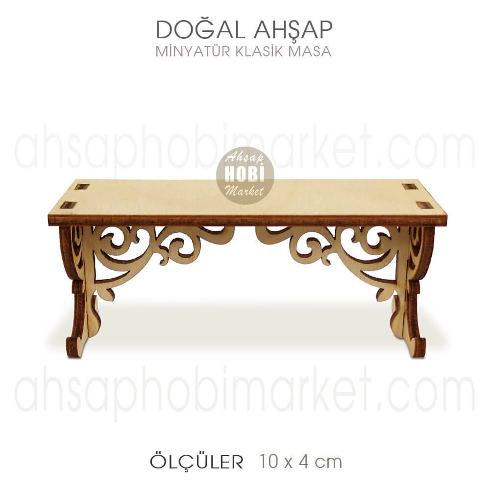 Ahşap Minyatür Klasik Oymalı Masa, 3mm kaliteli kavak ağacı kontradan üretilmiş, barbie oyun evlerinde, oyuncak olarak veya dekoratif maket uygulamalarında kullanılan, ithal plastik ürünlerin aksine doğal ahşaptan imal edilen, çocukların çok seveceği ve oynamaktan sıkılmayacağı, ev eşyası maketleridir. Su bazlı olan ve olmayan, akrilik ve sentetik her türlü boya ve verniğe uygun, uzun ömürlü ve dayanıklı objelerdir. Minyatür eşyalar çocuklar tarafından kullanılacak ise su bazlı akrilik boyaları tercih ediniz.