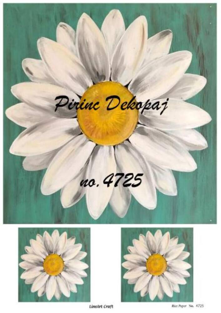 LineArt Papatya Desenli Pirinç, Dekopaj - Model : 4725, pirinç, çeltiğinden ü,retilmiş, her tü,rlü, hobi projesinde kullanılabilen, dekopaj tutkalı ile yapıştırılabilen, yapıştırıldığı yü,zeyde hava kabarcığı bırakmayan, birinci kalite dekopaj kağıdıdır. Pirinç, Dekopajların ü,zerleindeki desenler, kullanıldığı ü,rü,nü,n gö,rkemli ve ü,st dü,zey gö,zü,kmesini sağlamaktadır.