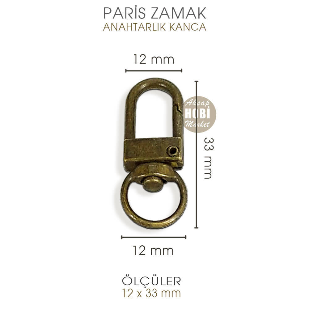 Antik Renkli Paris Zamak Anahtarlık Kancasının boyu 3,3 cm genişliği ise 1,2 cm ölçüsündedir. Detaylı boyutlar için ölçü resmine bakınız. Ürün 1 adetlik ambalajında size gönderilecektir. Fiyat 1 adet ürün içindir.
