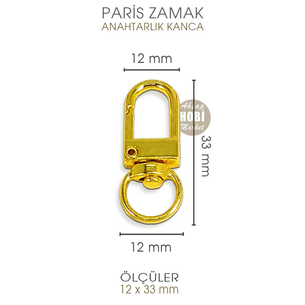 Parlak Altın Renkli Paris Zamak Döküm Anahtarlık Kancasının boyu 3,3 cm genişliği ise 1,2 cm ölçüsündedir. Detaylı boyutlar için ölçü resmine bakınız. Ürün 1 adetlik ambalajında size gönderilecektir. Fiyat 1 adet ürün içindir.
