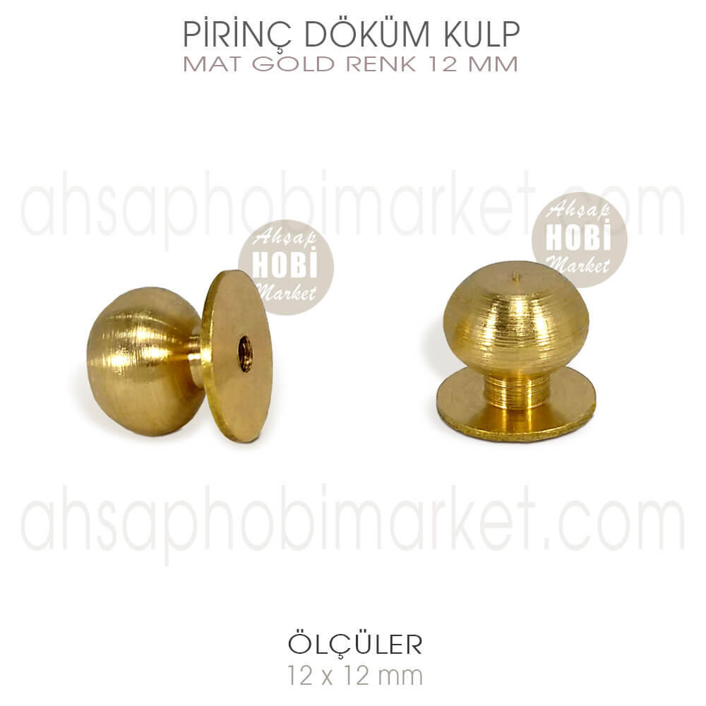 Mat altın rengi pirinç metal döküm top düğme kulp, 1,2 cm çapında ve bağlantı noktasından 1,2 cm yüksekliğindedir. Montaj yapılan noktaya denk gelen taç kısmı 1,4 cm çapındadır. Detaylı Ölçüler için 3. görsel resime bakabilirsiniz.