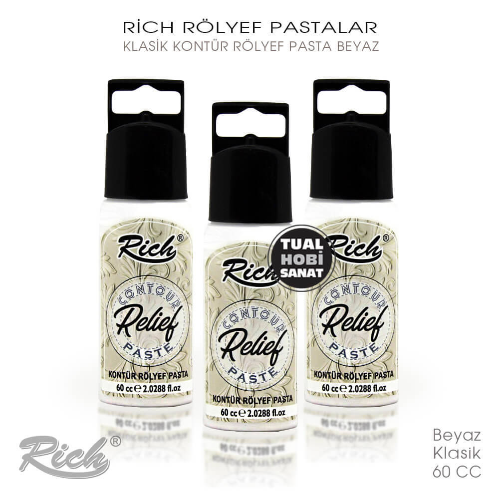 Rich Kontör Rölyef Pasta'yı ahşap, mdf, metal, seramik, cam, kumaş, plastik, duvar, strafor, karton, polyester, alçı, alçıpan, mum, tual, deri, craft kağıtları, kartonpiyer ..vb. boyanabilen tüm sert yüzeylerde kullanabilirsiniz. Rich Kontür Rölyef Pastalar su bazlı olup, içerisinde sağlığa zararlı toksik madde bulundurmazlar.