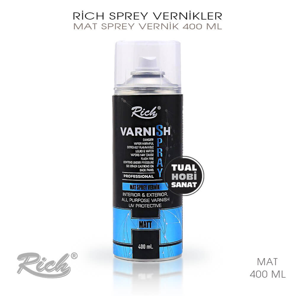 Rich Sprey Vernik, 400 ml ağırlığında piyasaya sürülmüş, zeminin türüne göre 2-3 m2 alana uygulanabilen, akrilik tabanlı bir verniktir. 30 cm mesafeden, yaklaşık 30-45 derece açıyla, 2-3 dakika iyice çalkalandıktan sonra, mümkünse uygulama yapılan alanı yatay hale getirip, boya yapar gibi aynı yöne hareketlerle uygulanması tavsiye edilir. Akma yapmaması ve damlacık oluşmaması için aynı noktaya uzun süre sıkılmamalıdır.