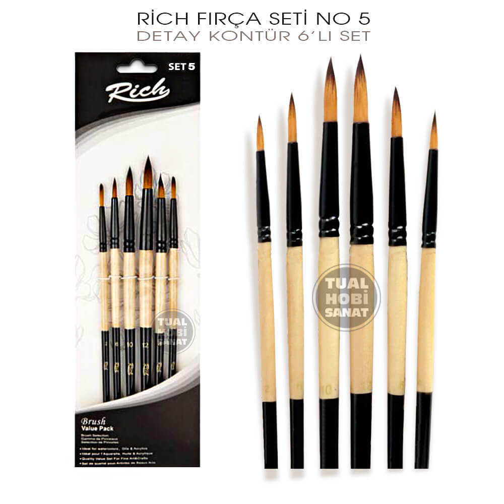 Rich Profesyonel Detay Kontur Fırça Seti No 3, 6 adet fırçadan oluşan, akrilik boya, yağlı boya ve sulu boya çalışmalarında kullanabileceğiniz, orta sertlikte ve dayanıklı samur kıl yapısıyla uzun zaman bozulmadan kullanabileceğiniz, üst düzey bir detay kontür fırça setidir.