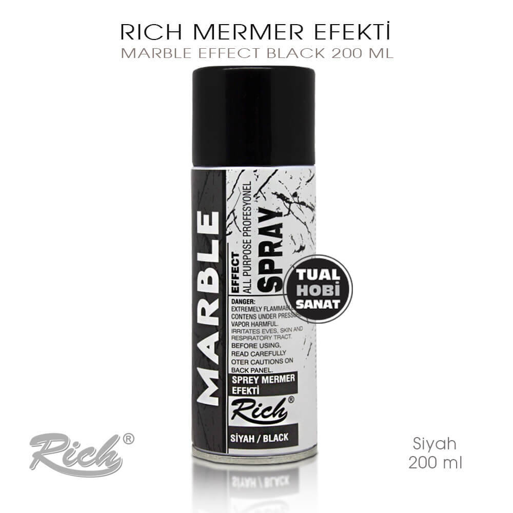 Rich Siyah Mermer Efekti, her türlü sert yüzeye uygulanabildiği gibi, kumaşlarında üzerine de uygulanabilir. Normal sert yüzeylerde taş vernik ile, kumaşlarda ise deri verniği ile sonlandırılması tavsiye edilmektedir. Ürün çocukların kullanımına uygun değildir.