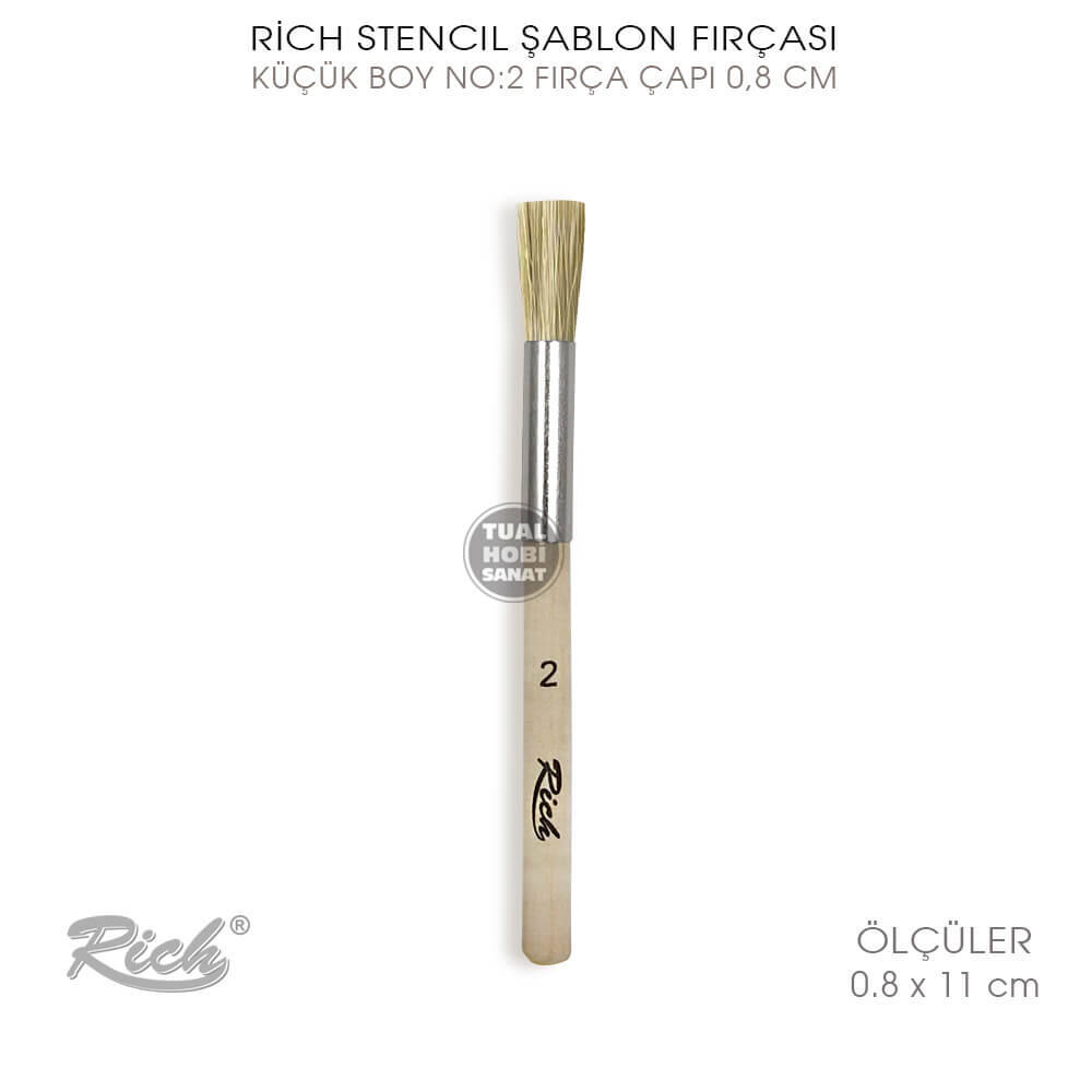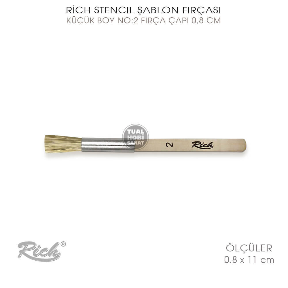 Rich Art Stencil ve Şablon Fırçaları, sık, doğal, dayanıklı ve sert kıl yapısı sayesinde tüm objelere stencil uygulaması yaparken güvenle kullanacağınız, su ve sabunla kolaylıkla temizlenebilen, pon ponlamak suretiyle dik olarak kullanabileceğiniz fırçalardır. Rich Stencil Fırçaları, seri çalışma özelliklerine sahip, hobi sektöründe kullanılan akrilik boyalara uygun, tüm hobiseverlerin olmazsa olmaz malzemelerinin arasında yer alır. Tüm yüzeylerde hızlı sonuç vermenin yanısıra, boyanın akmasını engeller. Hobi sektöründe kullanımının yanısıra sanatsal çalışmalarda tuval zeminlerinde çalı ve bitki yığınları yapımında da sıklıkla kullanılmaktadır.