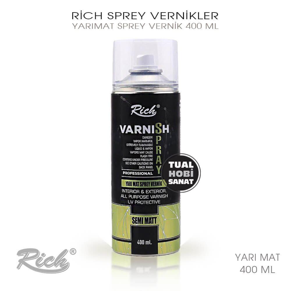 Rich Sprey Vernik, 400 ml ağırlığında piyasaya sürülmüş, zeminin türüne göre 2-3 m2 alana uygulanabilen, akrilik tabanlı bir verniktir. 30 cm mesafeden, yaklaşık 30-45 derece açıyla, 2-3 dakika iyice çalkalandıktan sonra, mümkünse uygulama yapılan alanı yatay hale getirip, boya yapar gibi aynı yöne hareketlerle uygulanması tavsiye edilir. Akma yapmaması ve damlacık oluşmaması için aynı noktaya uzun süre sıkılmamalıdır.