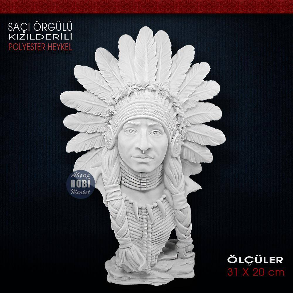 Saç Örgülü Kızılderili Heykeli (31x20 cm) Ham Polyester
