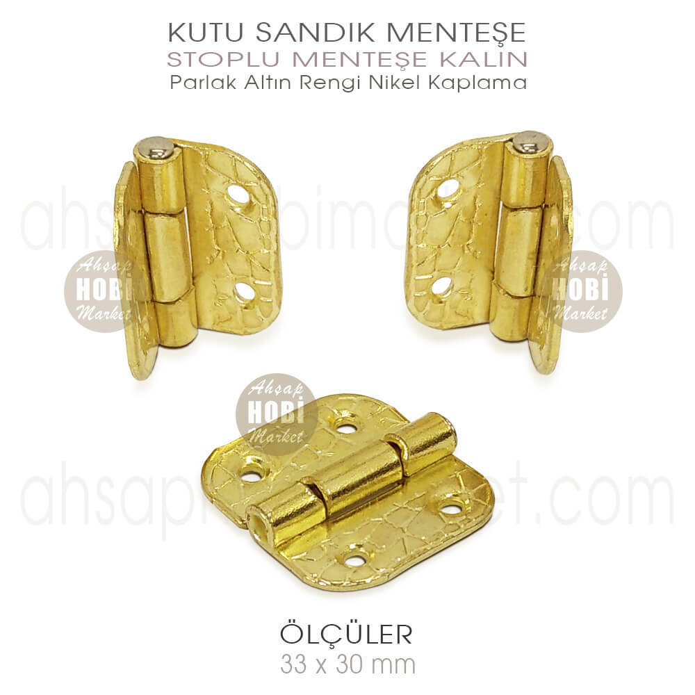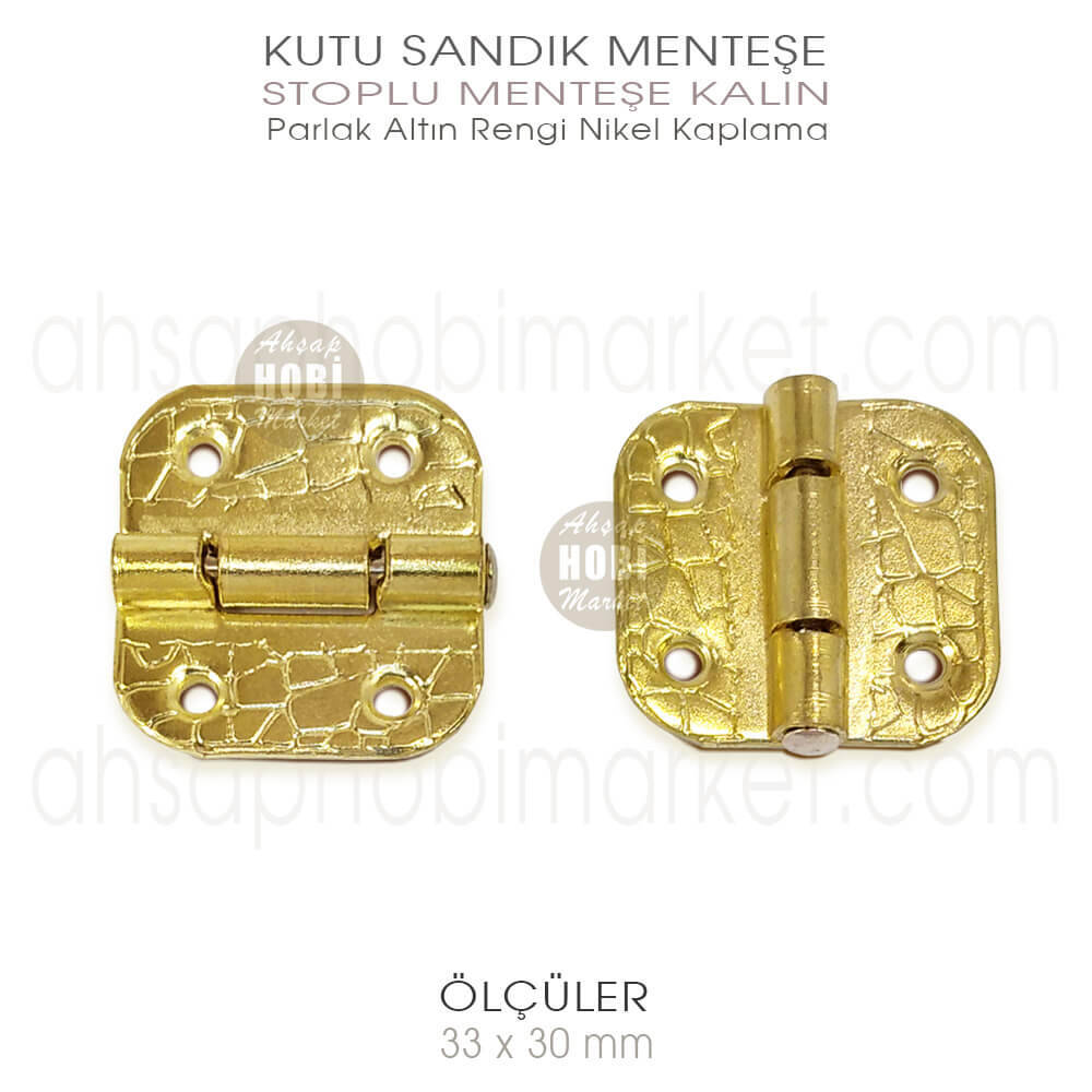 Parlak Altın Renkli Stoplu Menteşeler, kaliteli metalden üretilmiş olup, 3,3 cm yüksekliğe, 3,0 cm genişliğe sahiptir. Yaklaşık 2 mm kalınlığında dayanıklı metalden üretilmiş, yüzeyi çatlatma desenlidir. Vida delikleri havşalı olup taktığınız vidanın kafası dışarıdan profilden görünmez.