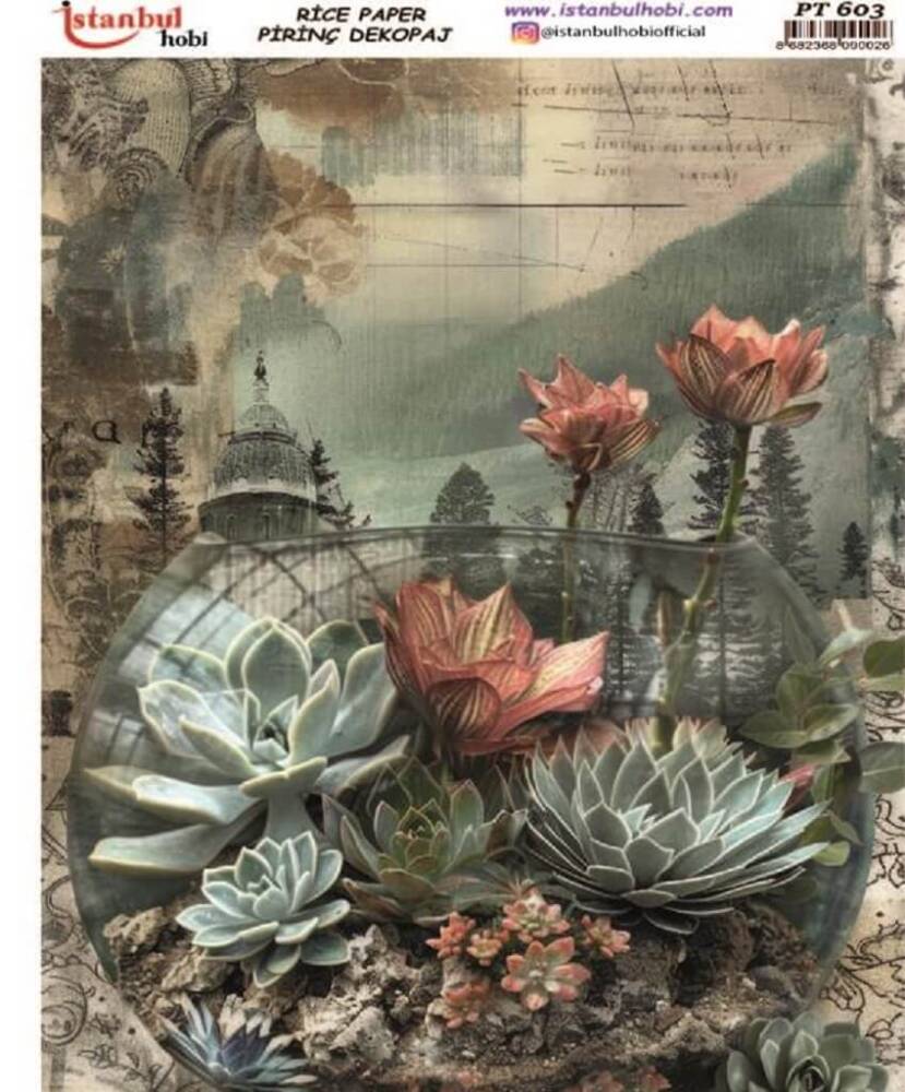 Sukulent Desenli Pirinç Dekopaj Model : PT 00603, pirinç çeltiğinden üretilmiş, her türlü hobi projesinde kullanılabilen, dekopaj tutkalı ile yapıştırılabilen, yapıştırıldığı yüzeyde hava kabarcığı bırakmayan, birinci kalite dekopaj kağıdıdır. Pirinç Dekopajların üzerleindeki desenler, kullanıldığı ürünün görkemli ve üst düzey gözükmesini sağlamaktadır.