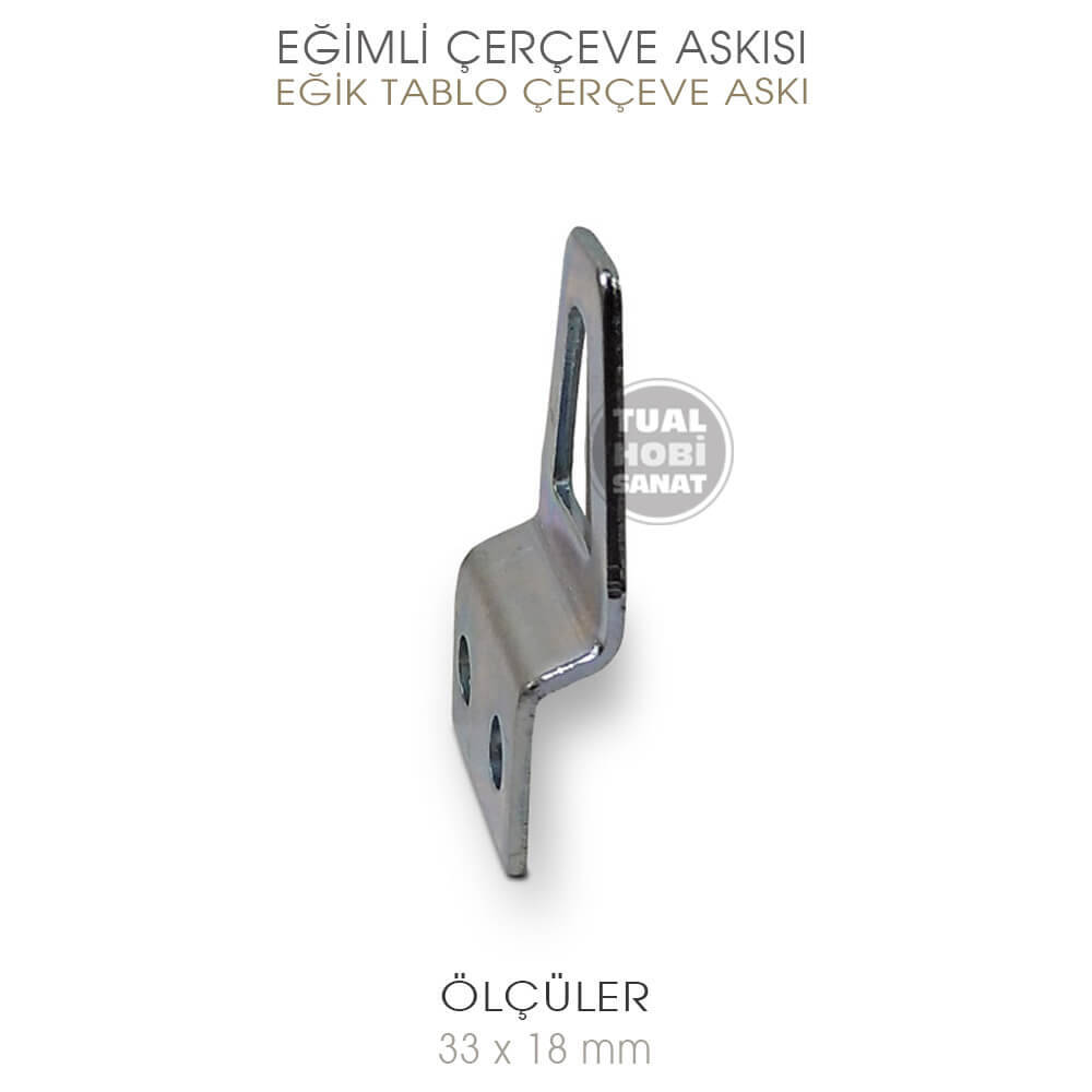Eğik Tablo Çerçeve Askı Aparatı 3,3 cm uzunluğunda, 1,8 cm genişliğinde, 5 mm eğimli ölçülere sahip olup, vida deliği çapı ise 4 mm boyutundadır.