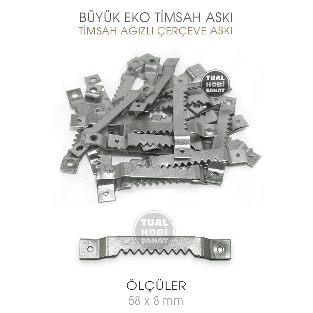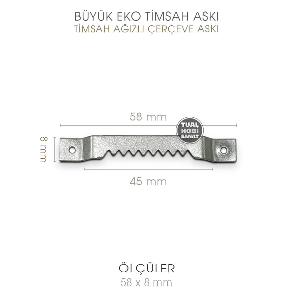 Timsah Ağızlı Ekonomik Çerçeve Askısının uzunluğu 58 mm, genişliği 8 mm, askı kısmı net 40 mm, vidalama deliği çapı ise yaklaşık 2-3 mm ölçüsündedir.