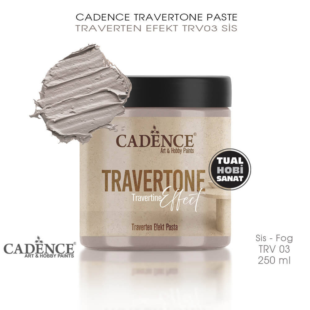 Emici olan veya olmayan tüm yüzeylere uygulanabilen ve objelerde traverten taşıyla yapılmış izlenimi bırakan cadence travertone efekt, bir rölyef pastadır. Boyama genellikle spatula yöntemiyle yapılır ancak ince bir katman isteniyorsa sert bir fırça veya pon pon fırça ile de uygulanabilir. Rölyef pasta kuruduğunda rahatlıkla zımpara ile zımparalanabilir.
