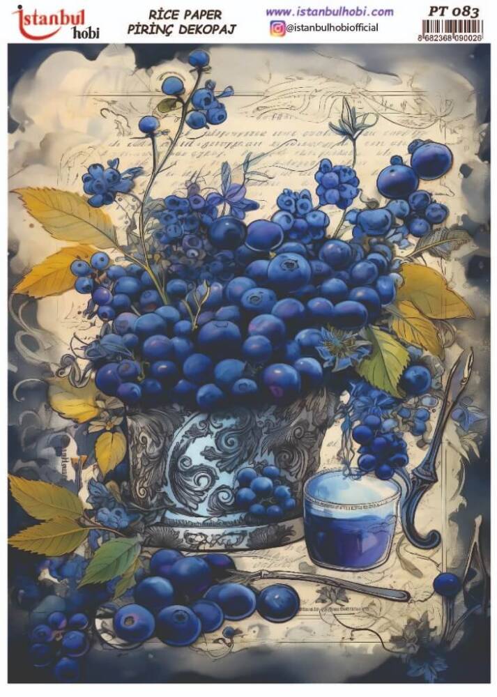 Yaban Mersini Desenli Pirinç Dekopaj - Model : PT 00096, pirinç çeltiğinden üretilmiş, her türlü hobi projesinde kullanılabilen, dekopaj tutkalı ile yapıştırılabilen, yapıştırıldığı yüzeyde hava kabarcığı bırakmayan, birinci kalite dekopaj kağıdıdır. Pirinç Dekopajların üzerleindeki desenler, kullanıldığı ürünün görkemli ve üst düzey gözükmesini sağlamaktadır.