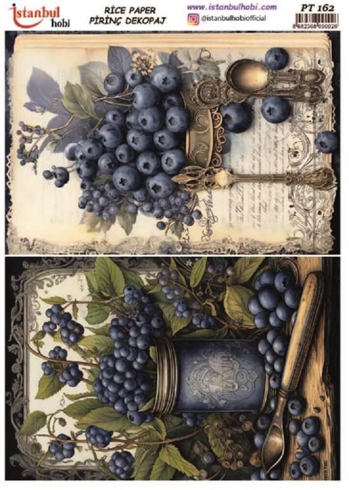 Yaban Mersini Desenli Pirinç Dekopaj - Model : PT 00162, pirinç çeltiğinden üretilmiş, her türlü hobi projesinde kullanılabilen, dekopaj tutkalı ile yapıştırılabilen, yapıştırıldığı yüzeyde hava kabarcığı bırakmayan, birinci kalite dekopaj kağıdıdır. Pirinç Dekopajların üzerleindeki desenler, kullanıldığı ürünün görkemli ve üst düzey gözükmesini sağlamaktadır.