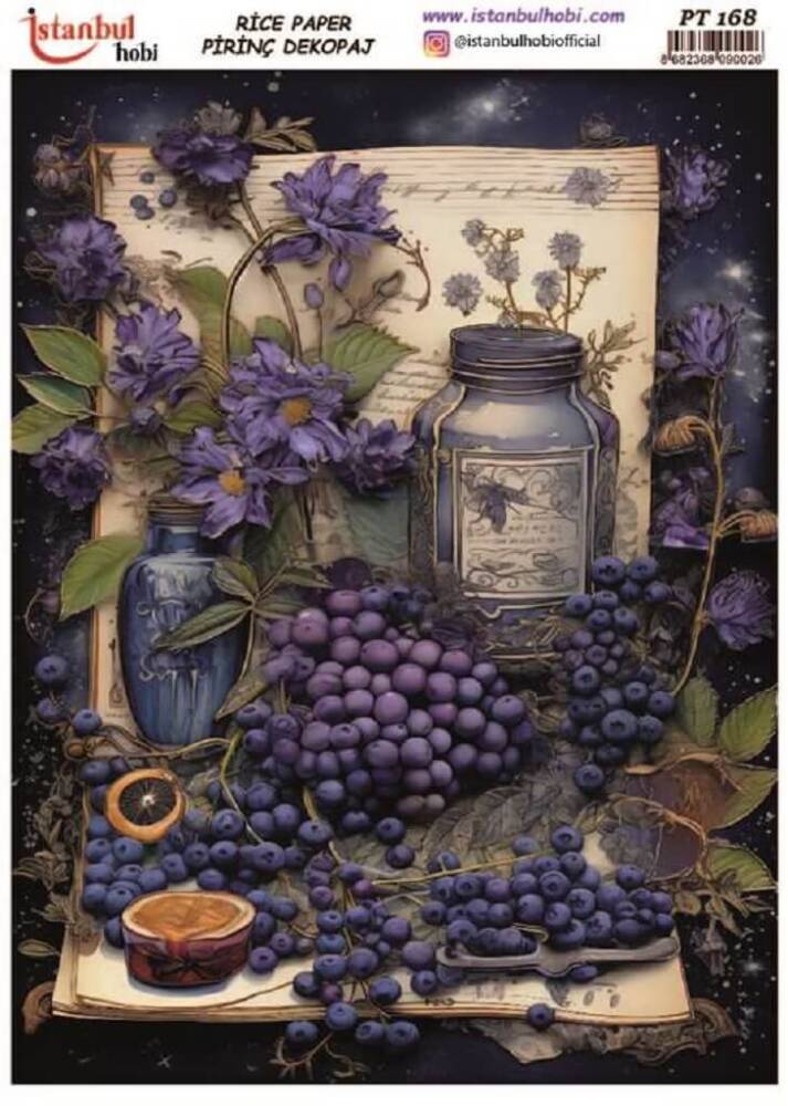 Yaban Mersini Desenli Pirinç Dekopaj - Model : PT 00168, pirinç çeltiğinden üretilmiş, her türlü hobi projesinde kullanılabilen, dekopaj tutkalı ile yapıştırılabilen, yapıştırıldığı yüzeyde hava kabarcığı bırakmayan, birinci kalite dekopaj kağıdıdır. Pirinç Dekopajların üzerleindeki desenler, kullanıldığı ürünün görkemli ve üst düzey gözükmesini sağlamaktadır.