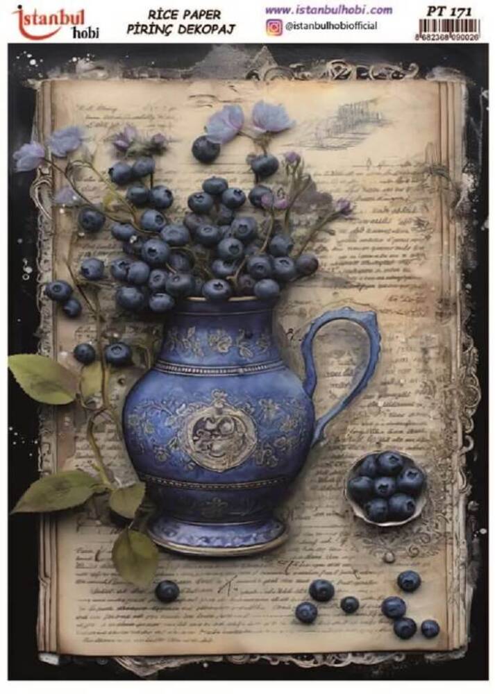 Yaban Mersini Desenli Pirinç Dekopaj - Model : PT 00171, pirinç çeltiğinden üretilmiş, her türlü hobi projesinde kullanılabilen, dekopaj tutkalı ile yapıştırılabilen, yapıştırıldığı yüzeyde hava kabarcığı bırakmayan, birinci kalite dekopaj kağıdıdır. Pirinç Dekopajların üzerleindeki desenler, kullanıldığı ürünün görkemli ve üst düzey gözükmesini sağlamaktadır.