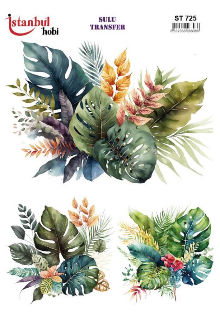 Sulu Transfer Kağıdı model STİ - 0725, her türlü hobi projesinde kullanılabilen, kendinden yapışkanlı, yapıştırıldığı yüzeyde hava kabarcığı bırakmayan, birinci kalite transfer kağıdıdır. Transfer Kağıtlarının üzerlerindeki desenler, kullanıldığı ürünün görkemli ve üst düzey gözükmesini sağlamaktadır.