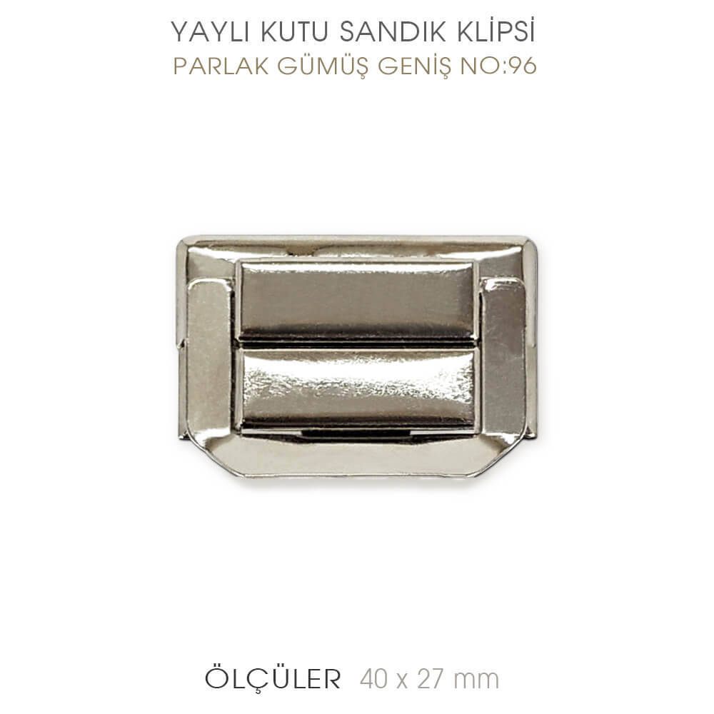 Parlak gümüş rengi büyük geniş yaylı kutu klipsleri, 40 mm eninde, 27 mm yüksekliğindedir.