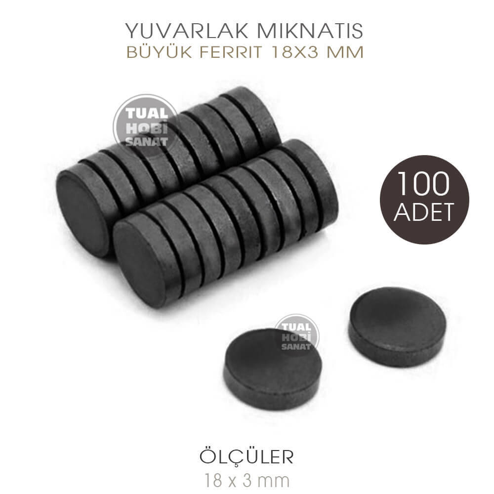 Büyük Boy Ferrit Yuvarlak Mıknatıs, 1,8 cm çapında, 3 mm kalınlığında olup, tarafınıza 100 adet olarak gönderilmektedir. Fiyat 100 adetlik paket içindir.