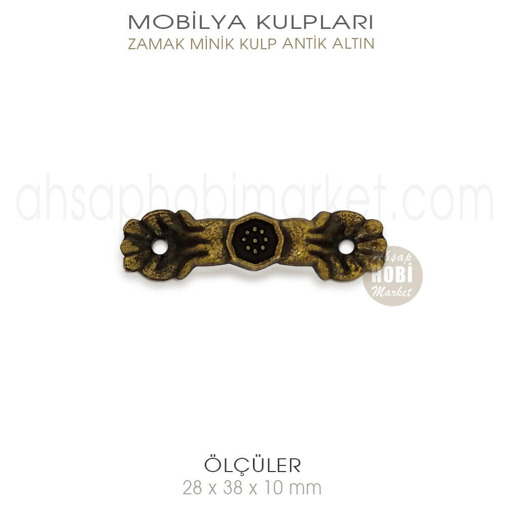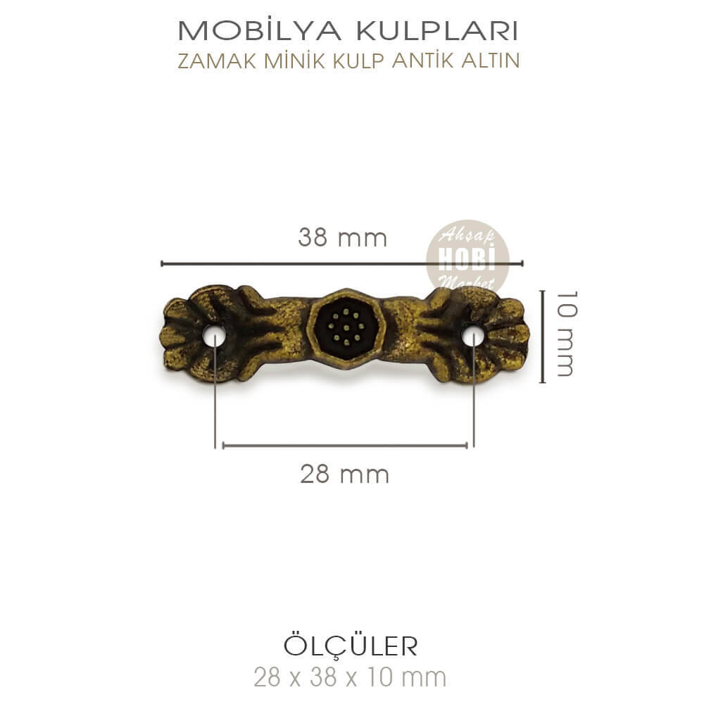 Antik altın rengi zamak mini kulp, iki vida arası 2,8 cm, toplam uzunluk 3,8 cm ve genişlik ise 1 cm ölçülere sahiptir. Detaylı ölçüler için 3. görsel resime bakabilirsiniz.