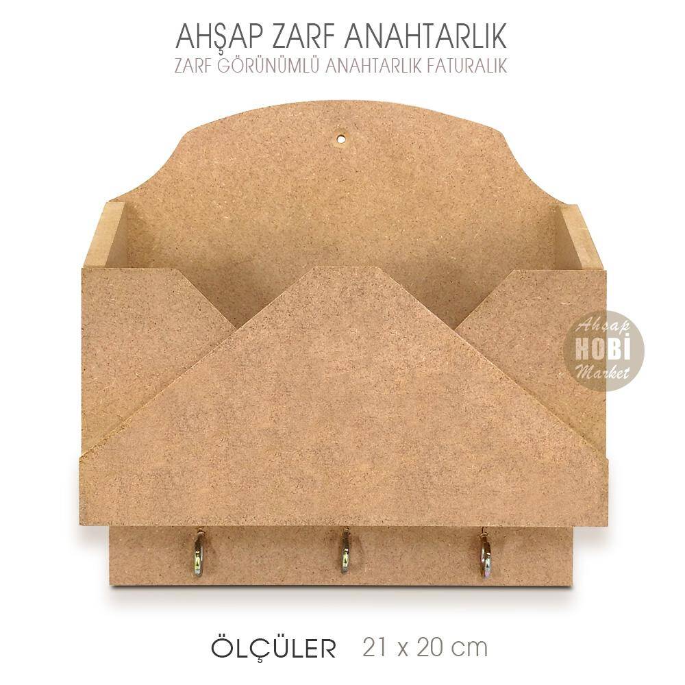 Ahşap Zarf Anahtarlık Faturalık, 21 cm yüksekliğinde, 20 cm genişliğinde ve 6,5 cm derinliğinde boyutlarda, kaliteli mdfden üretilmiş olup, duvara asmak suretiyle kullanılır.