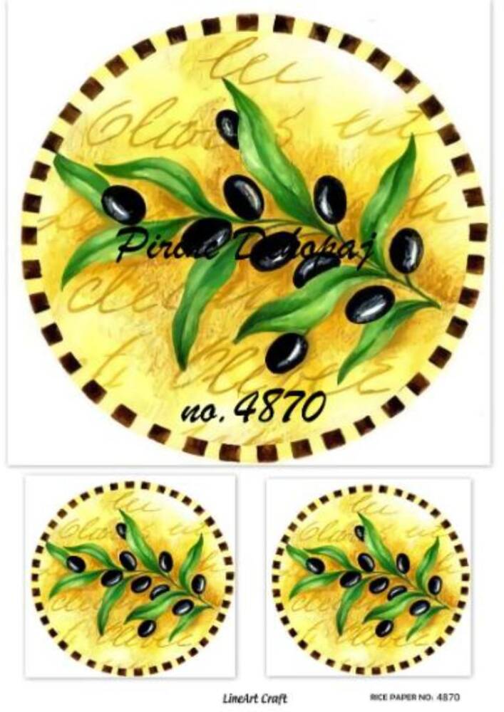 LineArt Zeytin Desenli Pirinç, Dekopaj - Model : 4870 , , pirinç, ç,eltiğinden ü,retilmiş, her tü,rlü, hobi projesinde kullanılabilen, dekopaj tutkalı ile yapıştırılabilen, yapıştırıldığı yü,zeyde hava kabarcığı bırakmayan, birinci kalite dekopaj kağıdıdır. Pirinç, Dekopajların ü,zerleindeki desenler, kullanıldığı ü,rü,nü,n gö,rkemli ve ü,st dü,zey gö,zü,kmesini sağlamaktadır.
