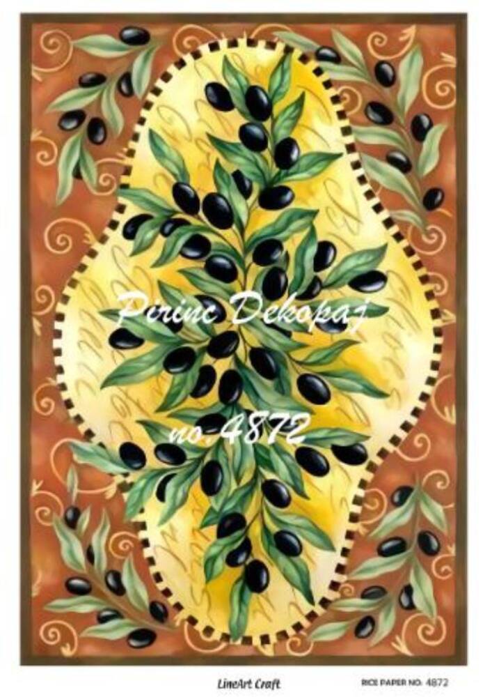 LineArt Zeytin Desenli Pirinç, Dekopaj - Model : 4872 ,, pirinç, ç,eltiğinden ü,retilmiş, her tü,rlü, hobi projesinde kullanılabilen, dekopaj tutkalı ile yapıştırılabilen, yapıştırıldığı yü,zeyde hava kabarcığı bırakmayan, birinci kalite dekopaj kağıdıdır. Pirinç, Dekopajların ü,zerleindeki desenler, kullanıldığı ü,rü,nü,n gö,rkemli ve ü,st dü,zey gö,zü,kmesini sağlamaktadır.